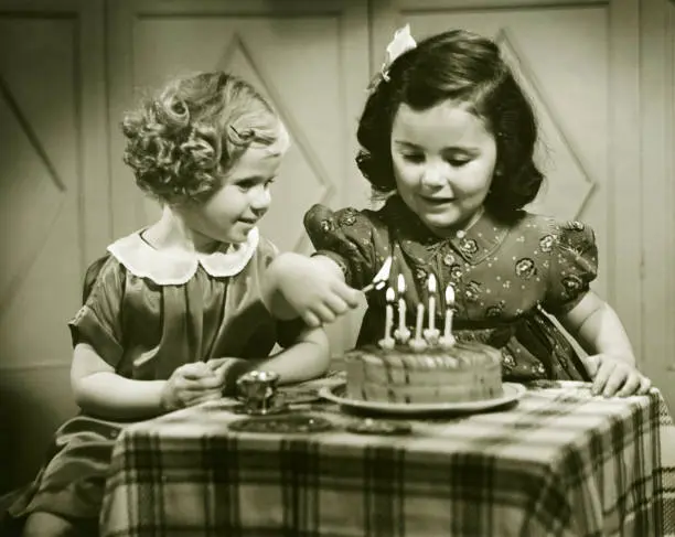 two little girls clapping and singing "Happy Birthday to you", with cheerful party music.